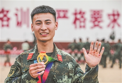 筆者在現(xiàn)場看到,官兵們斗志昂揚,在比拼體能、技能的同時,展現(xiàn)出過硬的意志品質(zhì)。在器械賽場上,戰(zhàn)士常國浩5分鐘內(nèi)完成了75個標準的單杠卷身上,打破了支隊該項目紀錄?!白龅降?0個的時候,我的手掌上已經(jīng)磨出了血泡,但是聽到大家的加油聲,我逼著自己不斷超越自我、挑戰(zhàn)極限……”賽后,常國浩激動地告訴戰(zhàn)友。