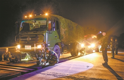 測(cè)量邊距、打入鐵釘、捆綁加固……鐵路裝載現(xiàn)場(chǎng),官兵僅憑汽車近光燈和手電照明,熟練地進(jìn)行分組作業(yè)。除了器械碰撞聲,很少聽(tīng)到其他聲音,全程一氣呵成、干凈利落。