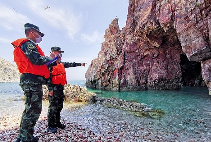 圖為海警執(zhí)法員對(duì)轄區(qū)無(wú)居民海島進(jìn)行踏查。包新宇 攝