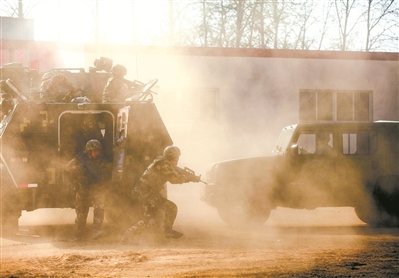 導(dǎo)調(diào)組下達(dá)“敵情”通報(bào):“‘暴恐分子’駕駛一輛越野車企圖沖擊我執(zhí)勤卡點(diǎn),迅速對(duì)其實(shí)施攔阻……”特戰(zhàn)隊(duì)員搭乘防暴裝甲車前去處置,途中遇到“暴恐分子”駕車加速?zèng)_來(lái)。在距離不足兩米遠(yuǎn)的地方,裝甲車駕駛員猛地轉(zhuǎn)向、剎車,橫擋在越野車前方將其截停。官兵隨即沖下車,將“暴恐分子”一舉抓獲。