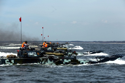 兩棲裝甲裝備件泛水編波訓練。王瑋 攝