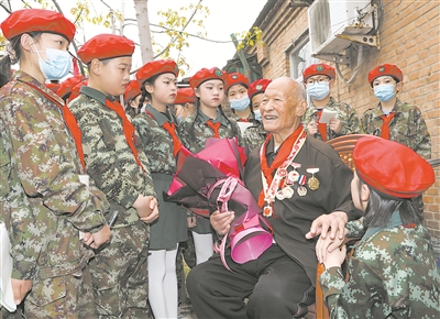 志愿軍老戰(zhàn)士康寶貞給前來(lái)看望自己的小學(xué)生講戰(zhàn)斗故事。李金良 攝