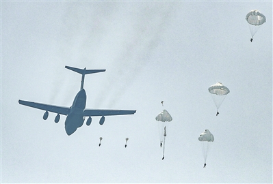 “跳!跳!跳!”離機信號響起,特戰(zhàn)隊員接連躍出機艙,朵朵傘花在空中競相綻放。安全著陸后,他們迅即投入戰(zhàn)斗行動之中。與此同時,擔任藍軍的某合成旅三營在預定地點展開防御,一場激烈對抗隨即上演。