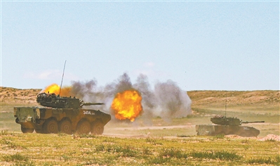 某型突擊車在機動中對“敵”實施火力打擊。