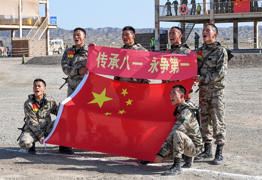 圖為中國陸軍參賽隊隊員賽后與國旗合影。張永進 攝