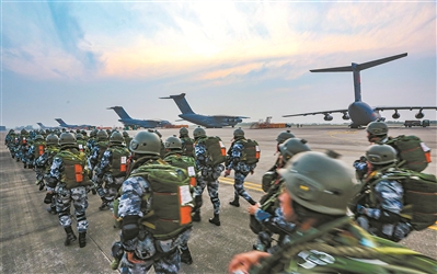 拂曉,某軍用機場,數(shù)百名傘兵迅速完成傘具整理和武器裝備披掛,空降空投骨干對重型裝備和空投物資進行裝載加固。通過3道檢查線后,傘兵們按照戰(zhàn)斗編組登上戰(zhàn)機。伴著震耳的轟鳴聲,多種機型運輸機編隊依次升空,飛赴預定空域。