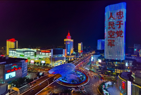 11月9日晚,為慶祝人民空軍成立72周年,上海五角場(chǎng)商圈“彩蛋”燈光演繹系統(tǒng)和周邊大樓樓體屏聯(lián)動(dòng)上演以“人民空軍忠于黨”為主題的燈光秀,吸引眾多市民駐足觀看。