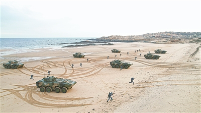 圖①:海軍陸戰(zhàn)隊某旅展開實戰(zhàn)化搶灘登陸演練。姜 順攝