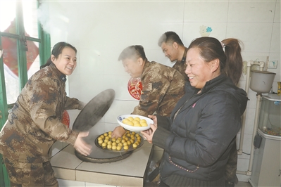 本報(bào)記者范奇飛(左一)與遼寧省營(yíng)口軍分區(qū)幫扶工作隊(duì)在馮家堡村與村民一起蒸黏豆包,寓意生活蒸蒸日上。紀(jì)勝強(qiáng) 攝