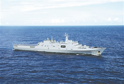 圖①:五指山艦在赴湯加運送救援物資途中破浪前行。喬晨曦 攝