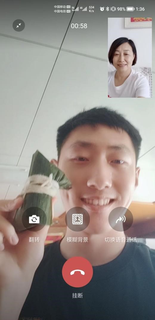 和媽媽撥通了視頻的執(zhí)法員小王高興地炫耀著手里的粽子:“媽媽,端午安康,不用擔(dān)心我,我在這邊一切都好,你看這是我自己包的粽子?!?/p>