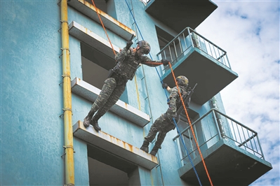 圖②:武警新疆總隊某支隊特戰(zhàn)隊員在反劫持演練中攀爬巖壁。余博 攝
