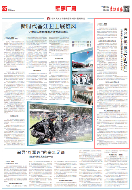 駐香港部隊少將副政治委員王兆兵對此深有感觸:“香港駐軍進駐25年來,堅持依法行動、依法治訓、依法管理、依法交往,被譽為‘威武文明之師’,連續(xù)多年民調(diào)顯示民眾認同感超過90%,這與我們持續(xù)開展法治宣傳教育是分不開的?!?/p>