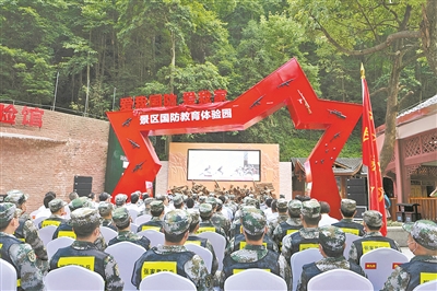 筆者走下景區(qū)“強軍號”小火車,一座紅色五角星形狀的“國防門”便映入眼簾,門上“愛我國防愛我家”7個大字引人注目。門內(nèi)的國防教育體驗園,是景區(qū)里一處別樣的風(fēng)景,也是近期熱度飆升的新晉熱門“打卡地”。據(jù)統(tǒng)計,85%的游客主動進(jìn)園體驗。