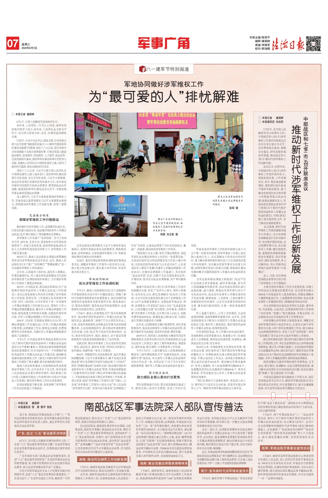 廣東軍地有關(guān)部門拓展法治宣傳教育途徑,首創(chuàng)“八五”普法強軍講師團和廣東省涉軍維權(quán)法治宣傳教育基地,致力提升駐粵部隊官兵法治意識和法治素養(yǎng),助力法治軍營建設(shè)和平安廣東建設(shè)。