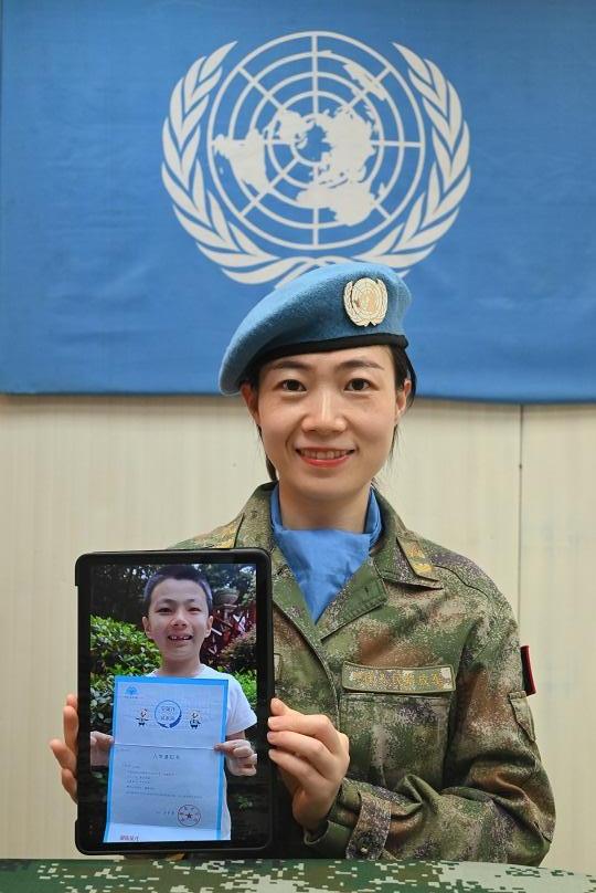 圖為維和醫(yī)療分隊(duì)隊(duì)員子女順利入讀駐地優(yōu)質(zhì)學(xué)校,向媽媽展示入學(xué)通知書。