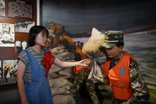 圖為武警工程大學(xué)學(xué)員萬鴻玥在武警安徽總隊合肥支隊史館父親萬四海的雕像旁緬懷追思。徐偉 攝