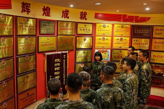 圖為武警陜西總隊漢中支隊勤務(wù)保障大隊副大隊長劉蕾在支隊史館為下隊新兵講述支隊建設(shè)發(fā)展歷程。李淼 攝