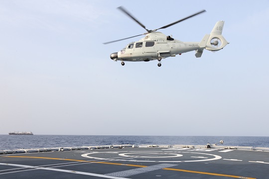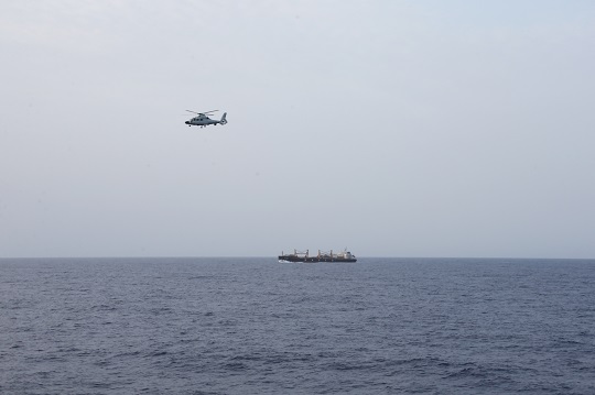 圖為當?shù)貢r間7月26日下午,編隊指揮艦淄博艦艦載直升機起飛,遠處為航行中的“海瀾之韻”號商船。孫飛 攝