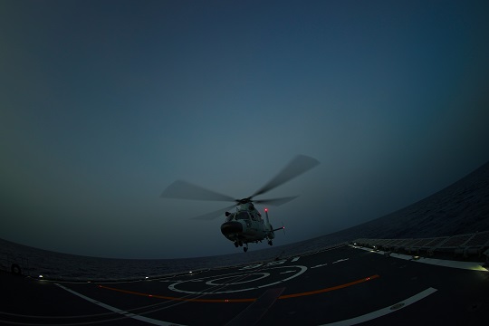 圖為當?shù)貢r間7月26日晚上,編隊指揮艦淄博艦艦載直升機完成警戒巡邏后任務后進行夜間著艦。張元虎 攝