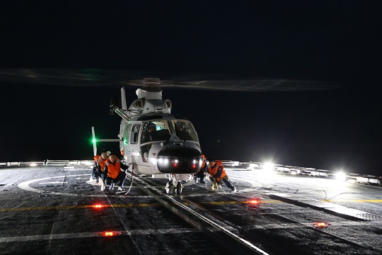 圖為當?shù)貢r間7月26日晚上,編隊指揮艦淄博艦艦載直升機完成警戒巡邏后任務后進行夜間著艦。孫飛 攝
