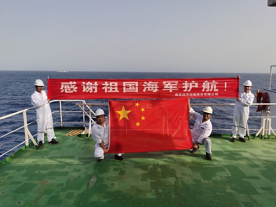 圖為當?shù)貢r間7月27日上午,安全抵達曼德海峽附近海域解護點后,“海瀾之韻”號商船船員在甲板上舉著五星紅旗、掛出橫幅向護航編隊表達感謝,遠處為航行中的中國海軍第44批護航編隊淄博艦?!昂懼崱碧柹檀L盧文山 供圖