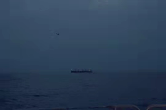 圖為當?shù)貢r間7月26日晚上,編隊指揮艦淄博艦艦載直升機正在“海瀾之韻”號商船附近??沼蜻M行夜間警戒巡邏。孫飛 攝