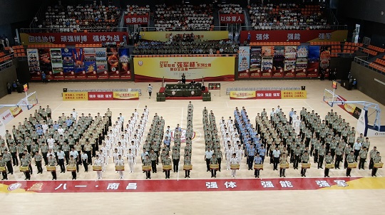 圖為8月1日上午,2023全軍院?!皬?qiáng)軍杯”系列比賽、集中交流賽在南昌市八一體育館舉行開(kāi)幕式。傅明鐘 攝