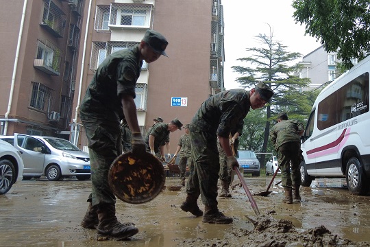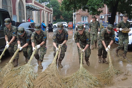 8月1日,北京市門頭溝區(qū)受連續(xù)暴雨和山洪影響,大量泥沙、草木堆積在河道兩側(cè)和市區(qū)道路,嚴(yán)重阻礙交通出行。中部戰(zhàn)區(qū)空軍某部組織官兵赴街道社區(qū),參與清除淤泥和垃圾20 余噸,積極配合駐地開展應(yīng)急支援和災(zāi)后秩序恢復(fù)工作。