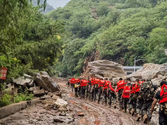8月4日,由于道路被沖毀,北京市房山區(qū)史家營鄉(xiāng)多個自然村斷水斷電,物資緊缺,武警北京總隊機動第二支隊緊急出動300余人,山區(qū)徒步40公里,人均負重30千克,將村民緊缺的食物,藥品,飲水送至村民手中,并轉運重傷災民、老人8人。