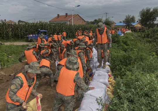 圖為北部戰(zhàn)區(qū)陸軍第78集團軍某合成旅和哈爾濱市民兵應急分隊在哈爾濱雙城區(qū)萬隆鄉(xiāng)組織堤壩加固。葉挺 攝