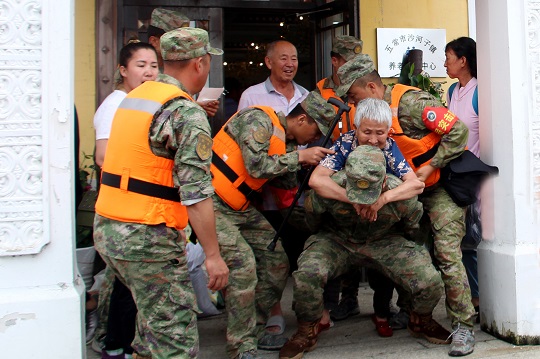 在該鎮(zhèn)敬老院,47名行動(dòng)不便的老人正在樓上“望水興嘆”。當(dāng)看見官兵來了,大家紛紛豎起大拇指。官兵背上老人,小心翼翼地蹚著齊膝深水一步步走出鎮(zhèn)子、走向安全地域。一位老大爺激動(dòng)地說:“解放軍好樣的,你們要是不來,我們真不知道該怎么辦?!?/p>