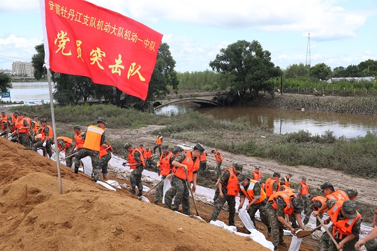 8月9日,武警黑龍江總隊出動500余名官兵對哈爾濱、牡丹江等地河流堤壩進行防水加固。