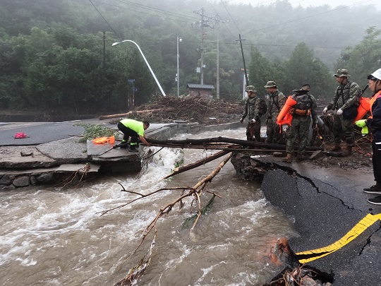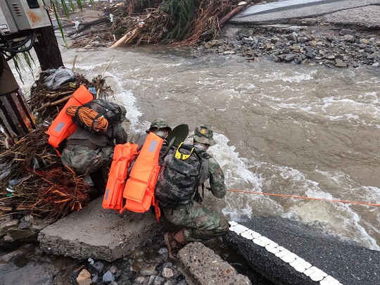 前進(jìn)路上,折斷的樹木和電線桿倒伏在河道,部分路基被河水全部掏空,路面整段塌陷下去?!翱禳c(diǎn),再快一點(diǎn),把情況摸清楚!”朱鵬宇和戰(zhàn)友們在沒過小腿的洪水中加速挺進(jìn)。