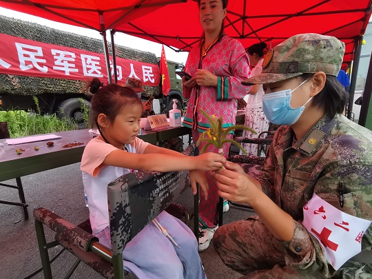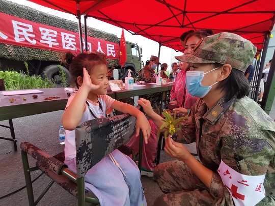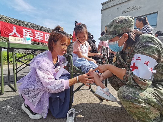 “寶貝兒放心,阿姨一定仔細(xì)給你瞧瞧,對(duì)癥用藥之后,就不會(huì)又癢又疼了?!贬t(yī)療隊(duì)員孟博從診斷席上走出來,將小女孩兒抱上軍用折疊椅,輕輕地?cái)]起小女孩兒的褲腿,發(fā)現(xiàn)小腿局部皮膚會(huì)出現(xiàn)紅腫、水皰,且有明顯瘙癢等癥狀,初步診斷為被毒蚊叮咬浸水感染。隨即對(duì)其創(chuàng)面清潔、消毒、涂藥,之后又給她贈(zèng)送了止癢、消腫、消炎等藥品,并向她媽媽交代了注意事項(xiàng)。