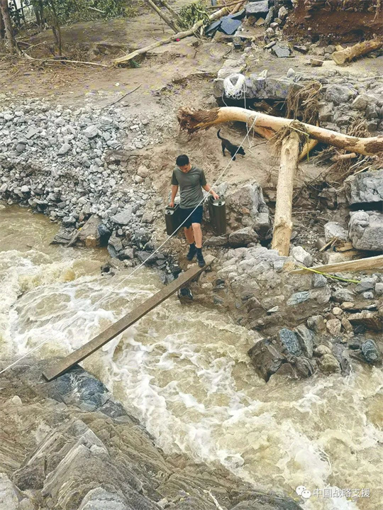 圖為某旅官兵攜帶裝備通過臨時(shí)搭建的簡易木板橋。唐琦智 攝