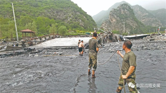 “駐地河堤決口,多個(gè)居民區(qū)被大水漫灌……”接到任務(wù)命令,該部迅速成立黨員先鋒隊(duì),100余名業(yè)務(wù)骨干攜帶防洪工具和搶修器材火速馳援昌平區(qū)某受災(zāi)地。