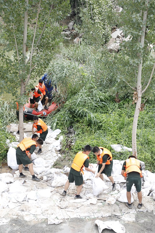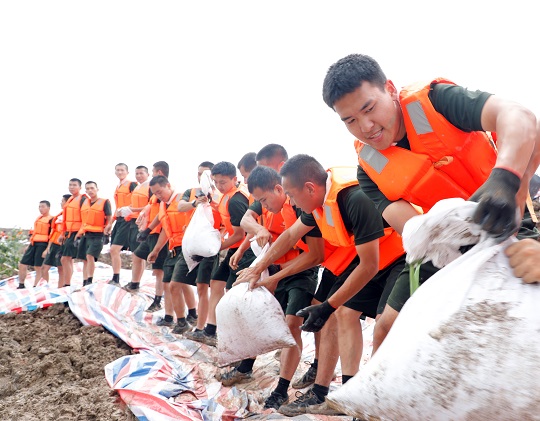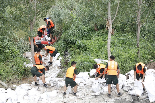 8月12日,武警第一機動總隊某支隊官兵對天津市靜海區(qū)茁頭排干渠大堤進行加固。