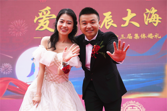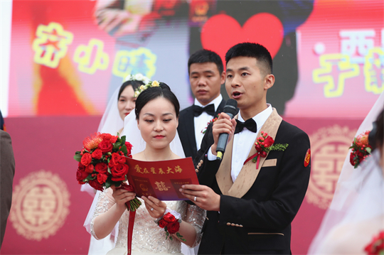 舞臺(tái)、氣球精心裝扮,美景、佳人喜迎幸?!槎Y現(xiàn)場,新郎們身著深色西裝,筆挺英??;新娘們身穿潔白婚紗,美麗動(dòng)人。一個(gè)個(gè)精心設(shè)置的儀式,一張張洋溢幸福的笑臉,讓這場集體婚禮甜蜜加倍、幸福爆表。
