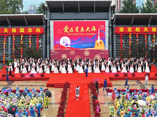 “星辰大海,夢(mèng)想自有夢(mèng)想的力量,仰望在銀河的想象,我們起航……”活動(dòng)最后,全體新人與觀禮人員共同合唱《星辰大海》。愛在星辰大海,新人們把愛的誓言唱響在航天大院,幸福的歌聲在青山之間久久回蕩……