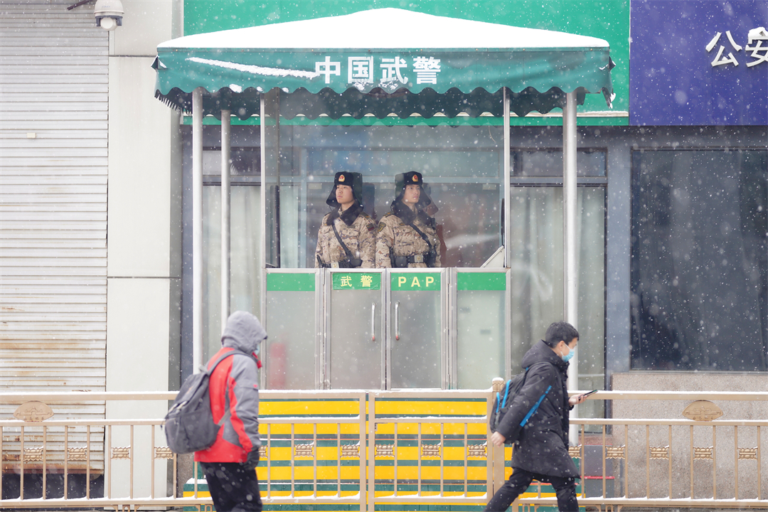 盡管降雪比較大,北京西站南北廣場、豐臺站仍然有不少旅客冒雪出行。武警官兵堅守在執(zhí)勤崗位,時刻觀察著周邊情況,積極熱情為旅客提供幫助,確保大家安全有序出行。