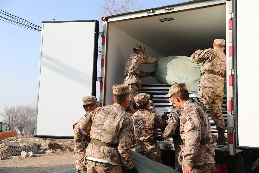 圖為武警青??傟犎蝿?wù)官兵正搬運物資并裝車。