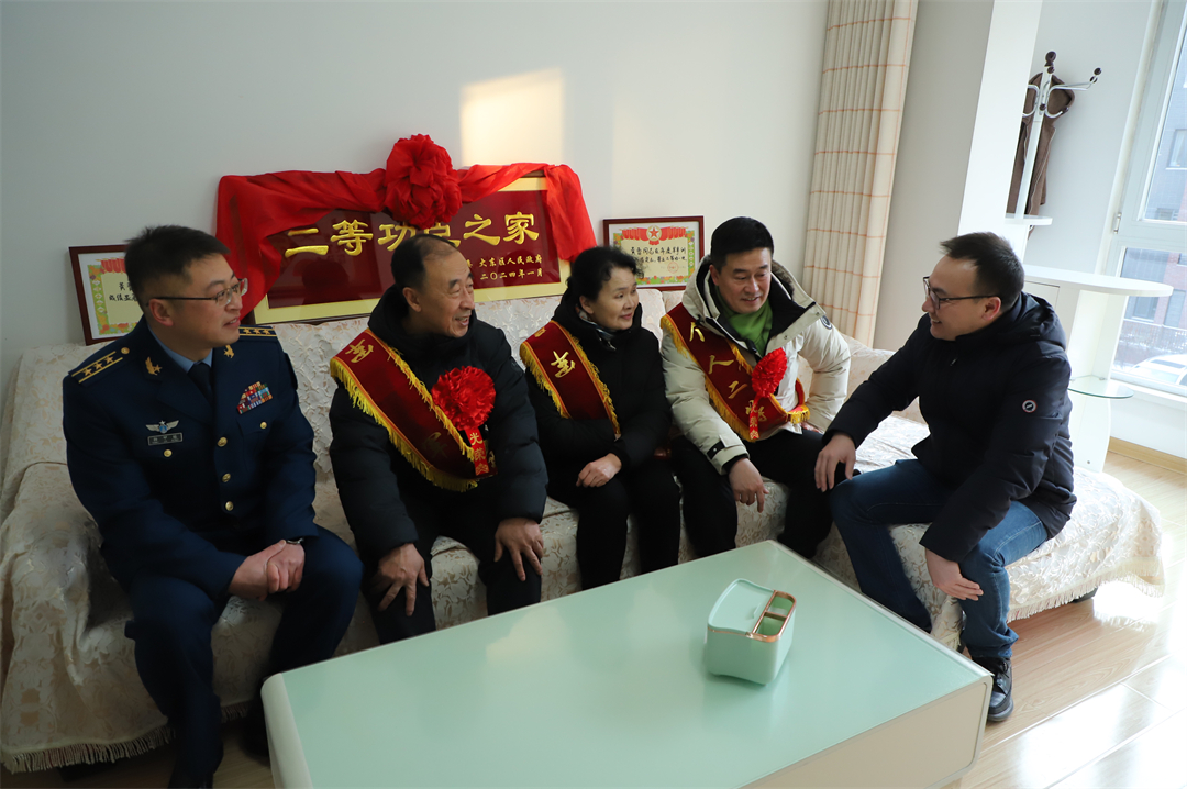 在黃晉家門前,軍地領(lǐng)導(dǎo)分別宣讀了黃晉同志的立功表彰決定,為黃晉同志頒發(fā)“二等功臣之家”牌匾,并為黃晉同志及家人佩戴大紅花和“一人立功 全家光榮”綬帶。