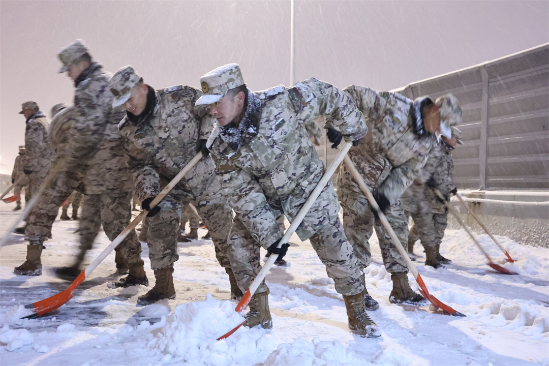圖為武警湖北總隊(duì)官兵清掃交通要道積雪。