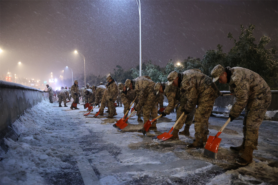 4日凌晨,武警湖北總隊(duì)訓(xùn)練基地接到駐地政府救援請求,駐地金山大道、臨空港大道等周邊多條高架和快速路匝道結(jié)冰,進(jìn)出車輛通行受到嚴(yán)重影響,已發(fā)生多起車禍。2時(shí)30分許,他們緊急出動投入到破冰搶險(xiǎn)工作中,至4日8時(shí),累計(jì)清理結(jié)冰道路2公里,清掃積雪15000多平方米,得到地方政府和人民群眾的高度贊譽(yù)。