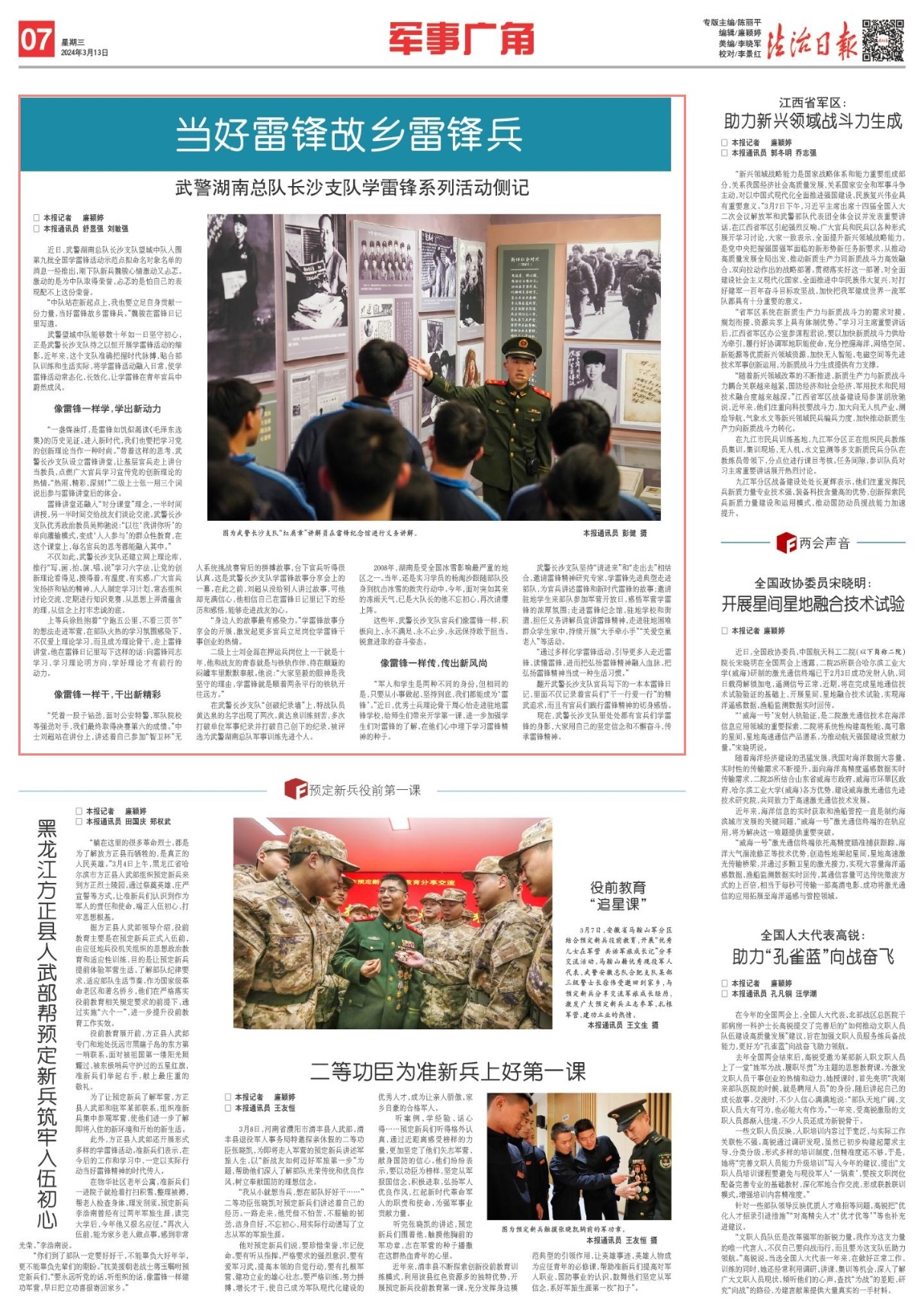 武警長沙支隊堅持“請進來”和“走出去”相結(jié)合,邀請雷鋒精神研究專家、學雷鋒先進典型走進部隊,為官兵講述雷鋒和新時代雷鋒的故事;邀請駐地學生來部隊參加軍營開放日,感悟軍營學雷鋒的濃厚氛圍;走進雷鋒紀念館、駐地學校和街道,擔任義務講解員宣講雷鋒精神,走進駐地困難群眾學生家中,持續(xù)開展“大手牽小手”“關(guān)愛空巢老人”等活動。