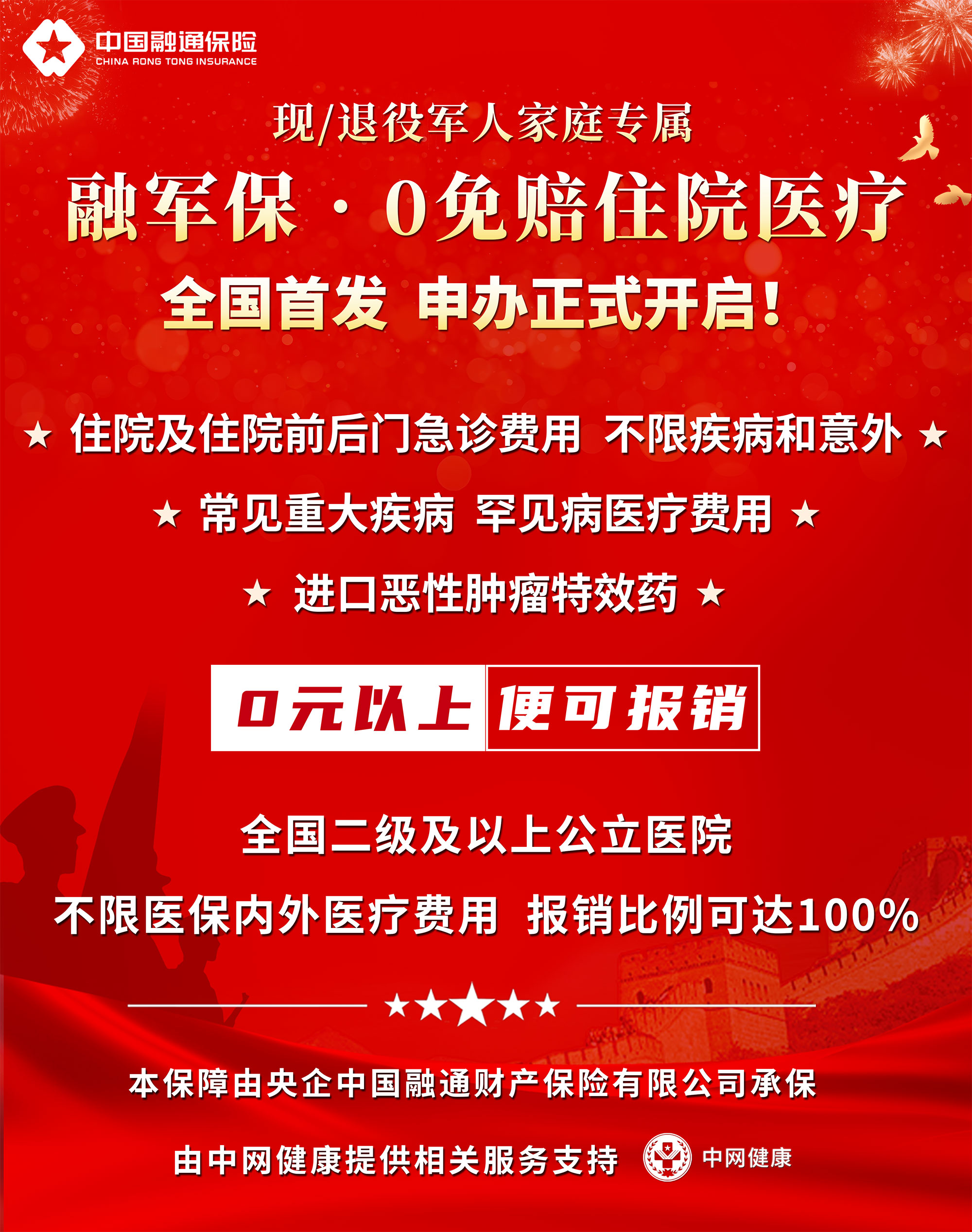 為深入貫徹落實(shí)黨的二十大關(guān)于退役軍人工作重要部署,履行“為軍惠軍”職責(zé)使命,體現(xiàn)中央企業(yè)服務(wù)經(jīng)濟(jì)社會(huì)高質(zhì)量發(fā)展的“國(guó)家隊(duì)、排頭兵”作用,進(jìn)一步提升退役軍人保險(xiǎn)保障水平。中國(guó)融通保險(xiǎn)發(fā)揮自身為軍服務(wù)“專門化、專業(yè)化”服務(wù)優(yōu)勢(shì),聚焦現(xiàn)/退役軍人家庭醫(yī)療現(xiàn)實(shí)需求,于2024年3月14日,聯(lián)合中網(wǎng)健康正式上線了《融軍?!?免賠住院醫(yī)療》保險(xiǎn)產(chǎn)品。此產(chǎn)品由中國(guó)融通保險(xiǎn)全面負(fù)責(zé)定制研發(fā),由中網(wǎng)健康提供相關(guān)配套服務(wù)支持。該保險(xiǎn)因其“0免賠”的保障優(yōu)勢(shì),真正實(shí)現(xiàn)了“看病住院,小錢、大錢均可報(bào)銷”。