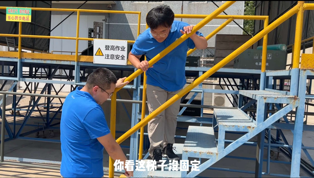 “這個梯子沒固定,上下平臺很容易摔倒。”視頻中,小翟叫住正準(zhǔn)備登上平臺的小劉,并帶著他一起將四個輪子鎖緊。這是在調(diào)試平臺測試時容易被忽略的一處隱患,視頻通過糾錯的方式,講解登高作業(yè)的操作規(guī)范,讓大家更容易入腦入心。