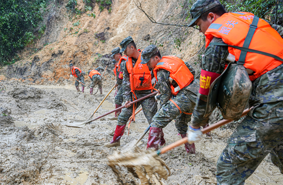 圖為武警廣東總隊(duì)韶關(guān)支隊(duì)官兵清理道路堵塞路段淤泥,為救援車輛進(jìn)入保駕護(hù)航。