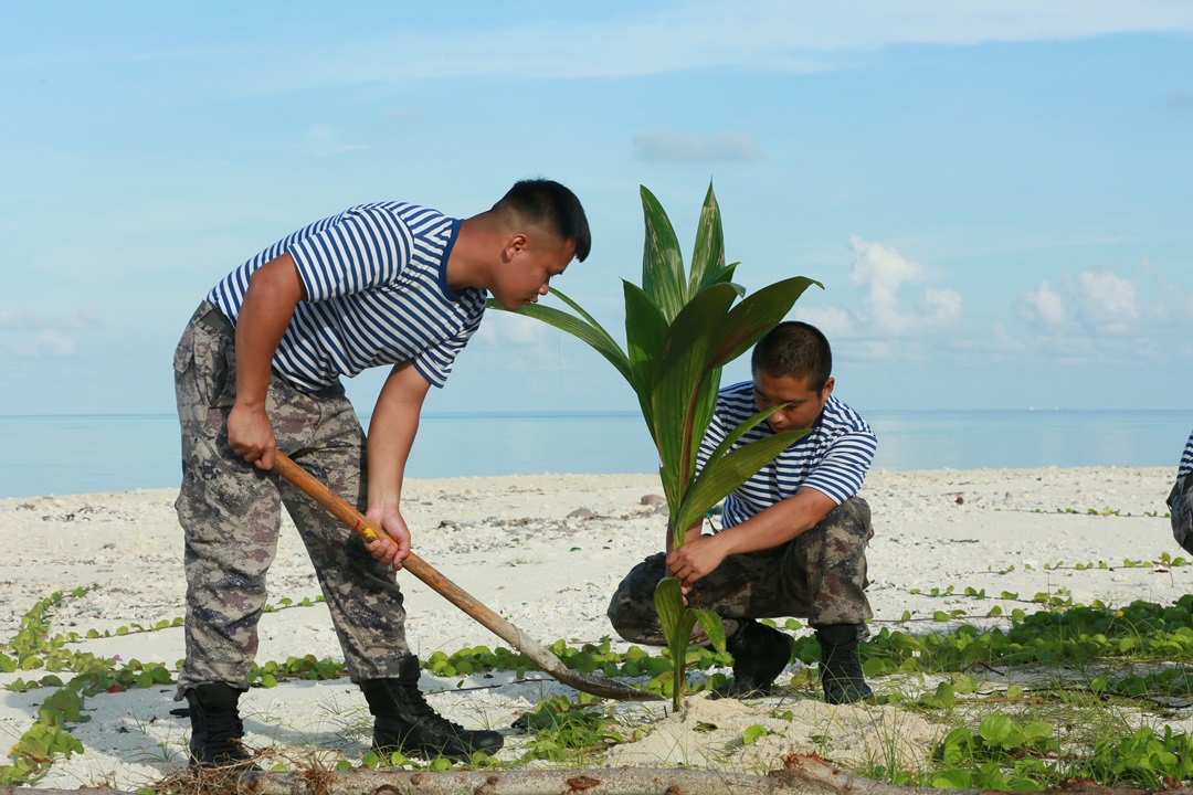 圖為西沙守備部隊(duì)官兵種植椰子樹(shù)。張鐘鑫 攝